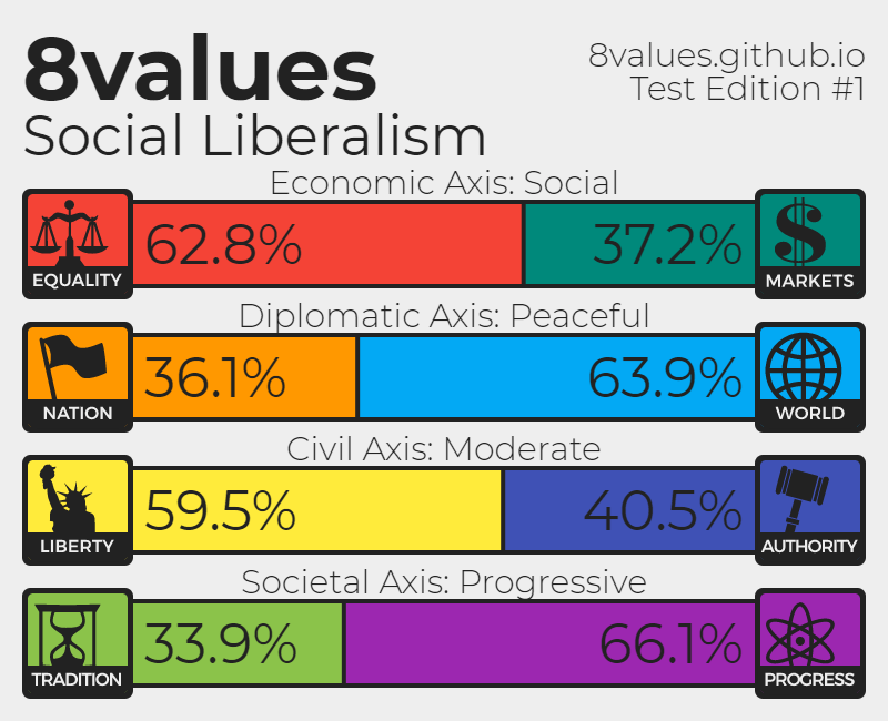Thankfully there are several other websites that are slightly more informative. These include “The Political Compass” and “8values” both of these are similar sites that ask similar questions. On both I ended up with a left leaning bias, According to “8Values, I tend to favor things such as Equality, a peaceful world, civil liberties and progressive values over things such as markets, a peaceful nation, an authoritative government, and traditional values.
